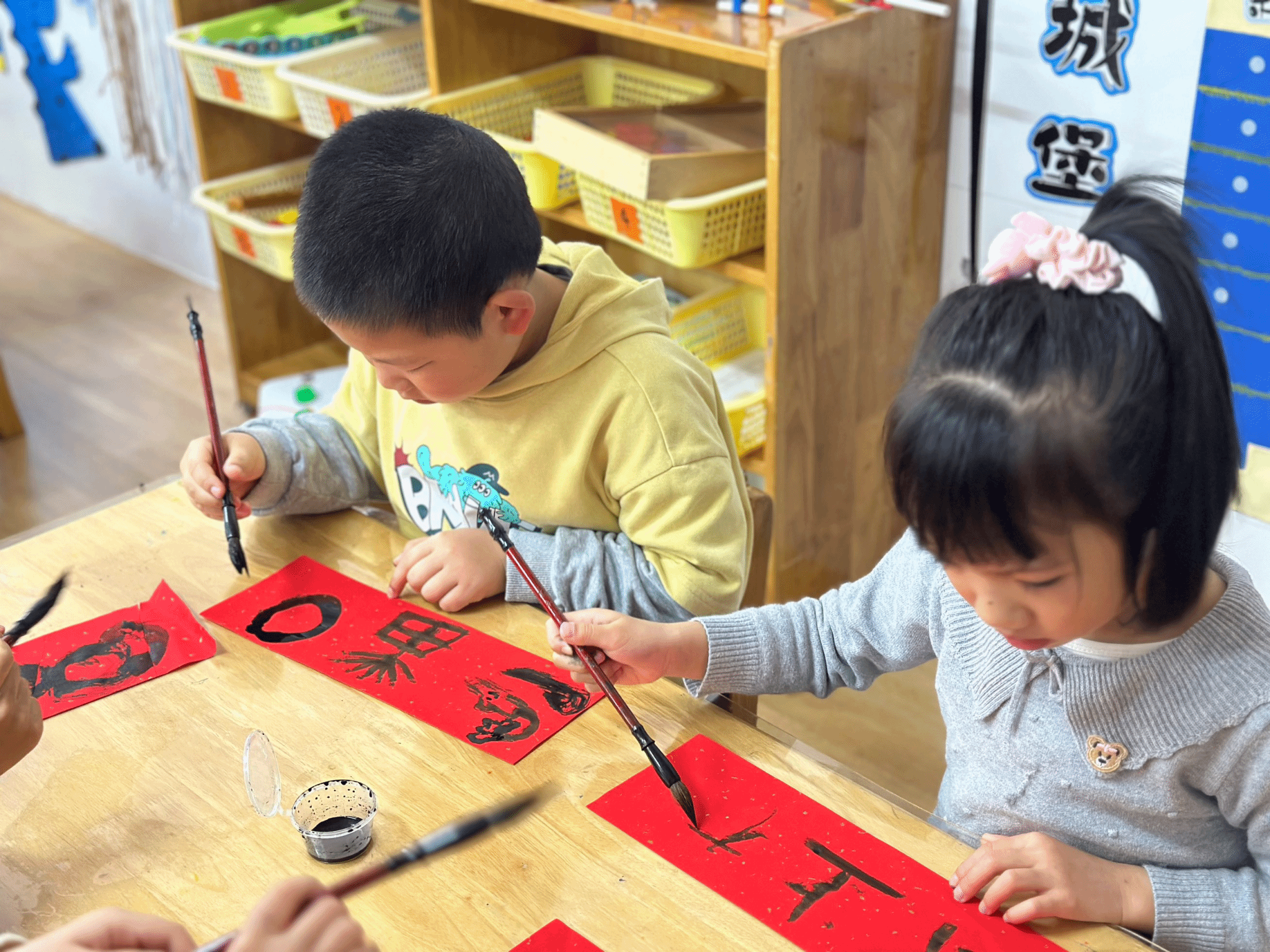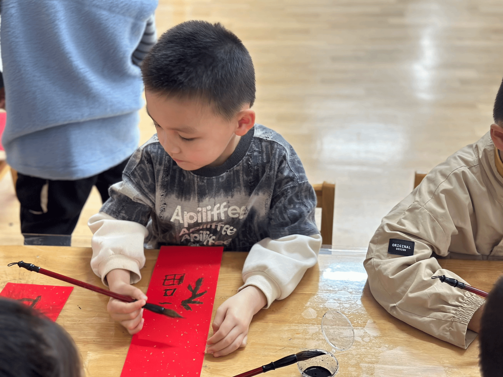 而当游戏的欢乐余温未散,幼儿园里又飘起了墨香,孩子们转身走进了传统年味的世界,用稚嫩的笔触书写新春的美好期许。红纸铺展,毛笔轻握,写春联活动正式拉开了新春序幕!孩子们端坐在桌前,神情专注地握着毛笔,在红纸上一笔一划地勾勒着福字与春联。虽然笔触还显稚嫩,墨痕也歪歪扭扭,但每一个笔画里都藏着孩子们对新年的好奇与期待。写春联不仅是对中华传统文化的近距离接触,更是一次独特的美育与实践体验。孩子们在握笔、运笔的过程中感受汉字的韵律美,在书写祝福的同时,也把对新年的美好心愿融进了笔墨里。