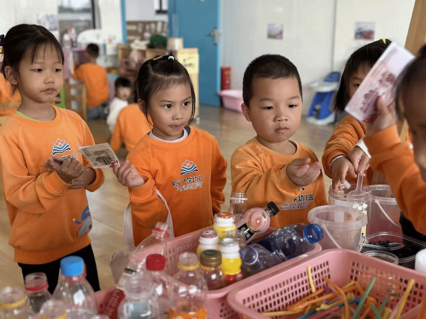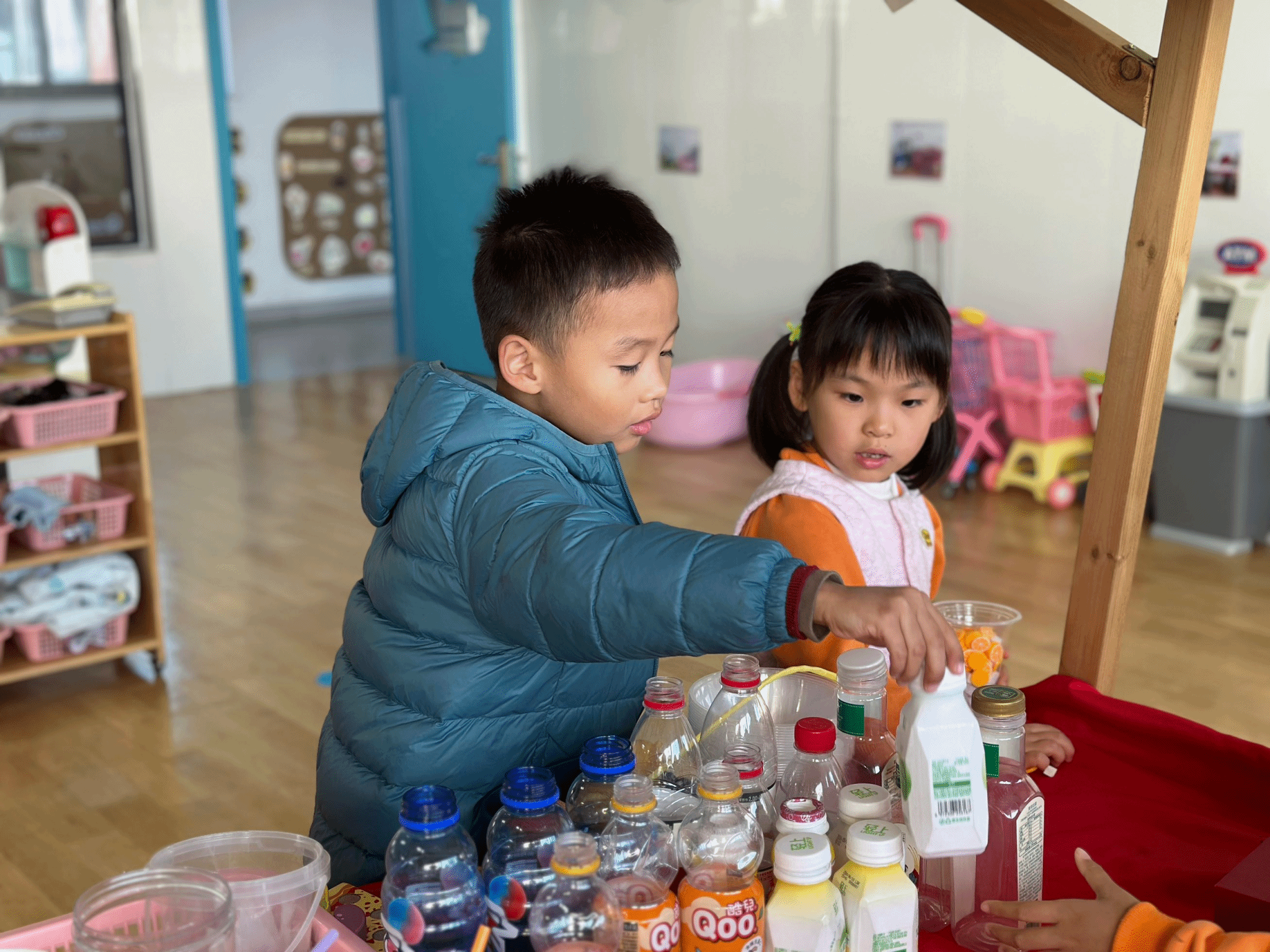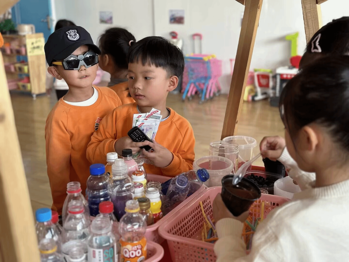 看!南墙小镇里一场热闹的角色扮演游戏正欢乐上演!孩子们化身小小厨师、店员,围着摆满仿真食材和厨具的“小摊位”忙得不亦乐乎。有的孩子认真摆弄着塑料蔬果,假装为“顾客”准备美食;有的孩子手持玩具手机,模仿着结账付款的模样,稚嫩的动作里满是投入与专注。在这自由的游戏氛围中,他们不仅发挥想象力构建着属于自己的“小世界”,还在互动中学会沟通、合作,把日常生活中的观察转化为生动的游戏体验。每一个认真的小模样,都是他们探索生活、表达自我的美好瞬间。这场充满童趣的角色游戏,让孩子们在玩中学、学中乐,也让幼儿园的日常时光变得更加鲜活有趣。
