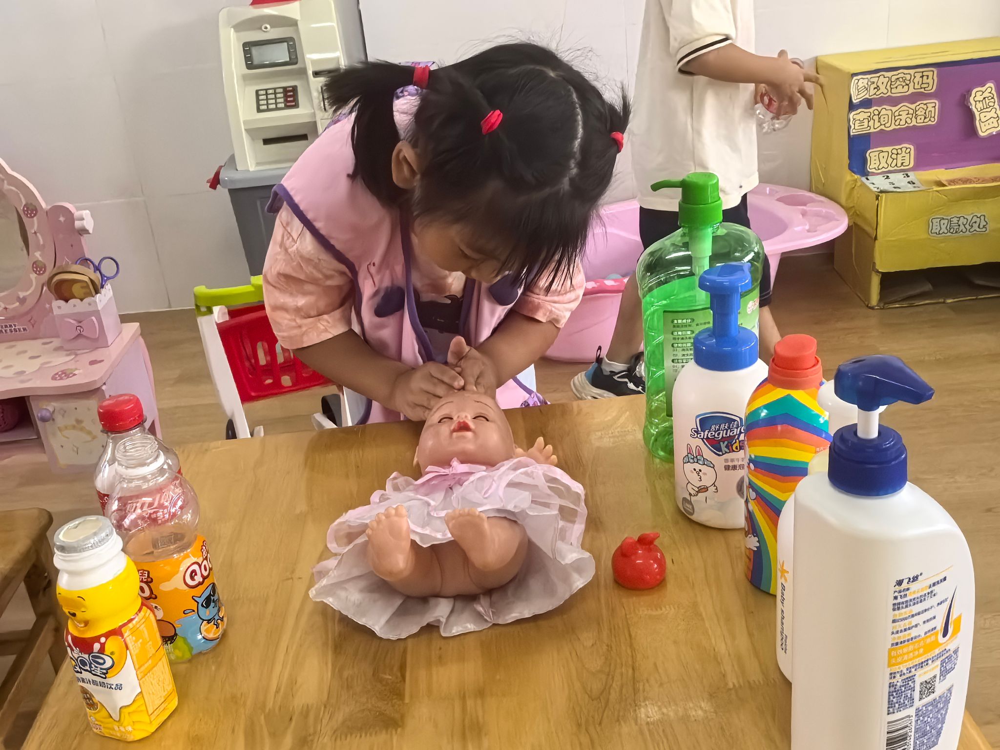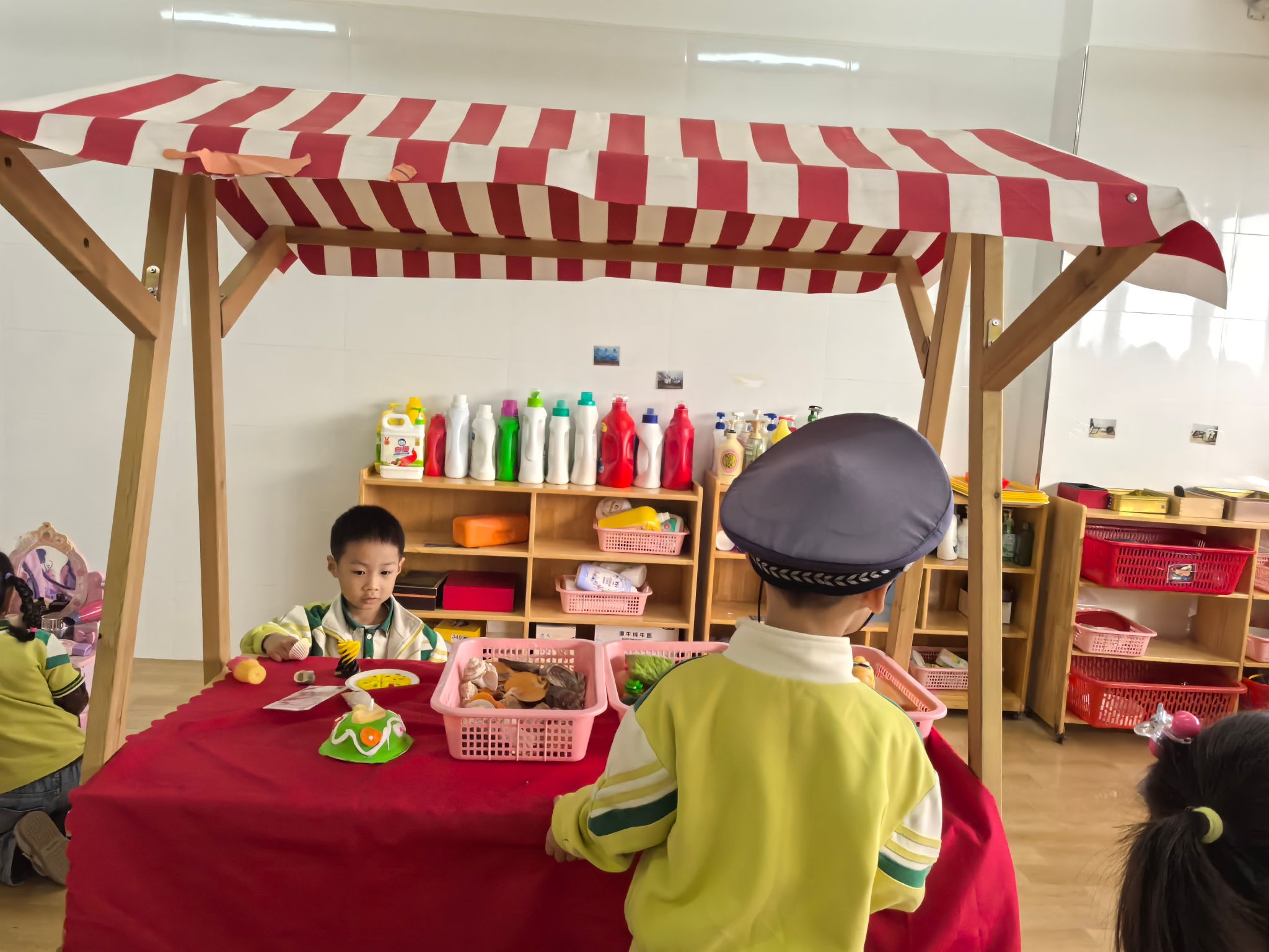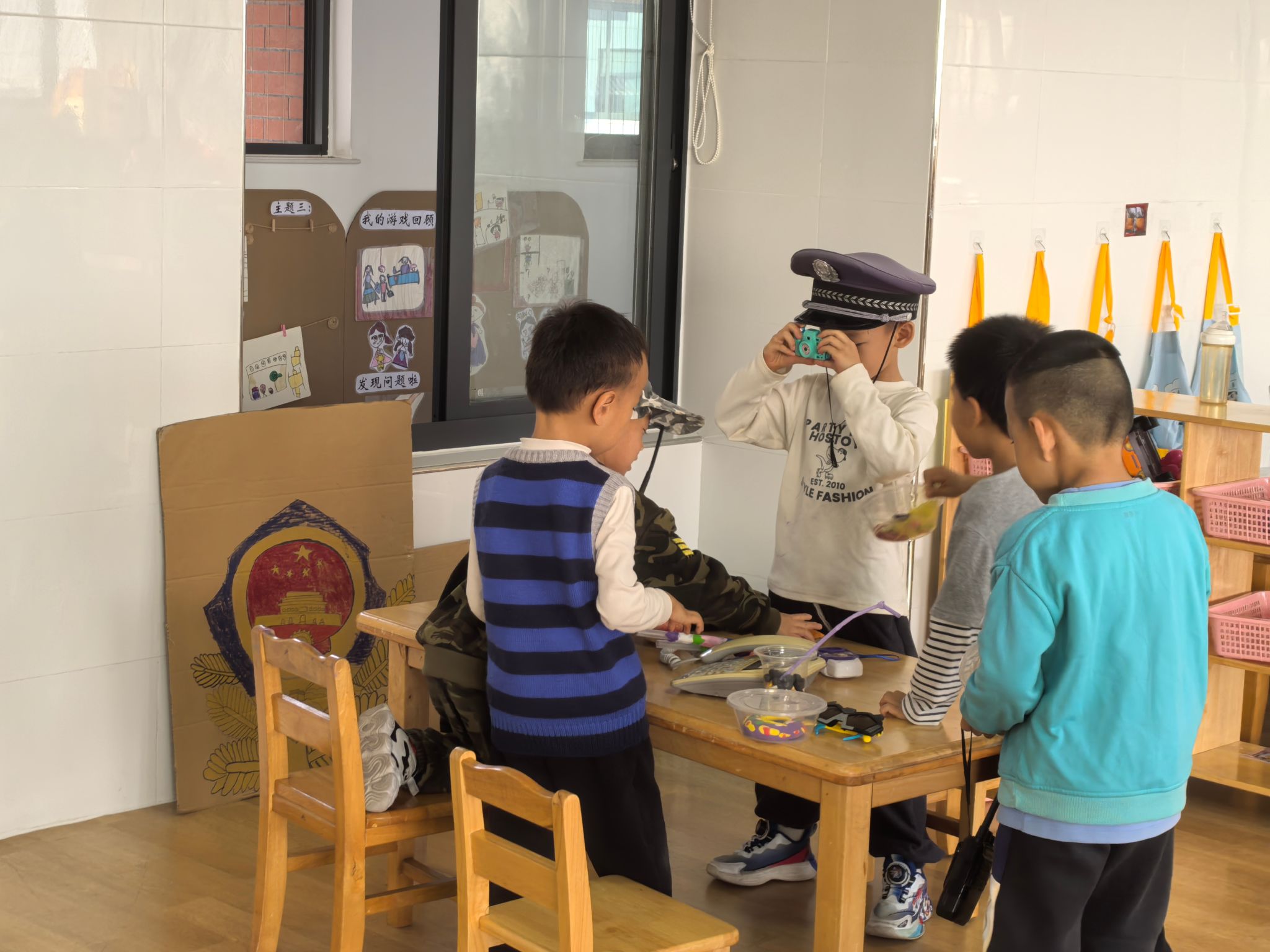 “不许动!我们是小警官!”警察局里,小警官们穿着帅气的警服,戴着警帽,手持“警棍”,精神抖擞地开展巡逻工作。他们认真地检查着活动室的每一个角落,守护着“小社会”的安全。当接到“求助电话”——“我的玩具不见了!”,小警官们立刻出发,仔细排查,耐心询问,最终成功帮“市民”找回了玩具。他们还会提醒大家“不要乱跑,注意安全”,用稚嫩的声音传递着责任与担当。在这个过程中,宝贝们懂得了警察的职责是保护大家,学会了勇敢与正义。