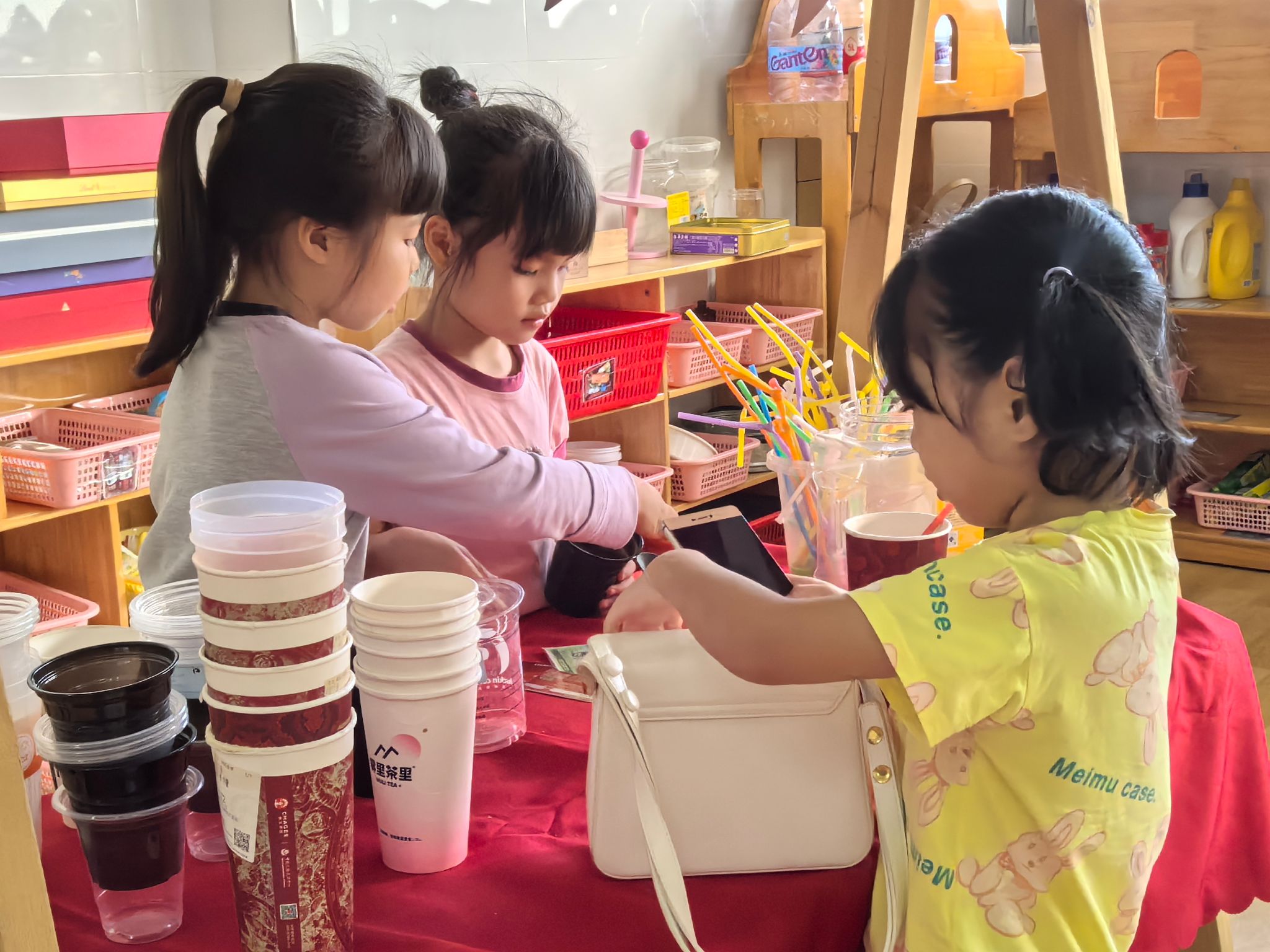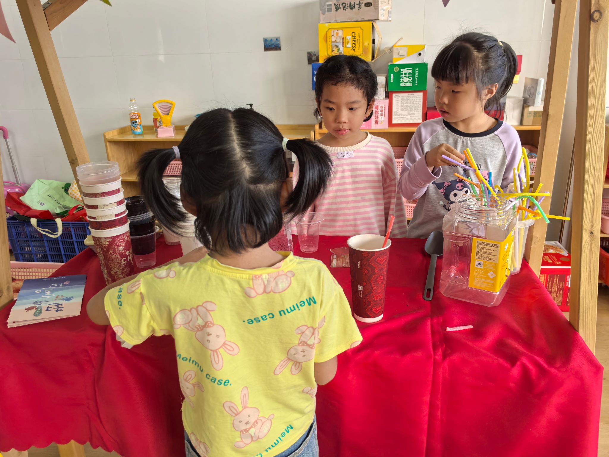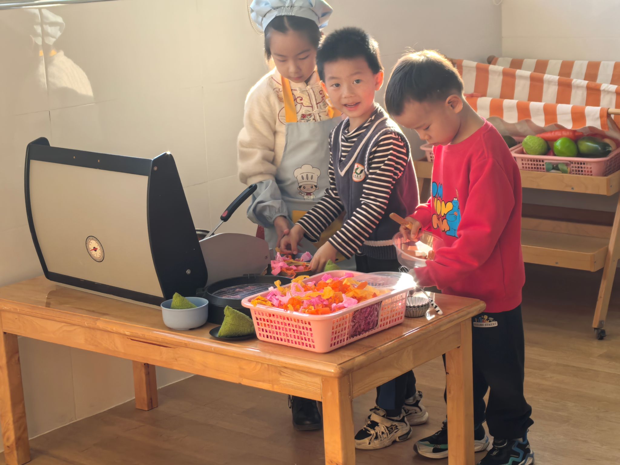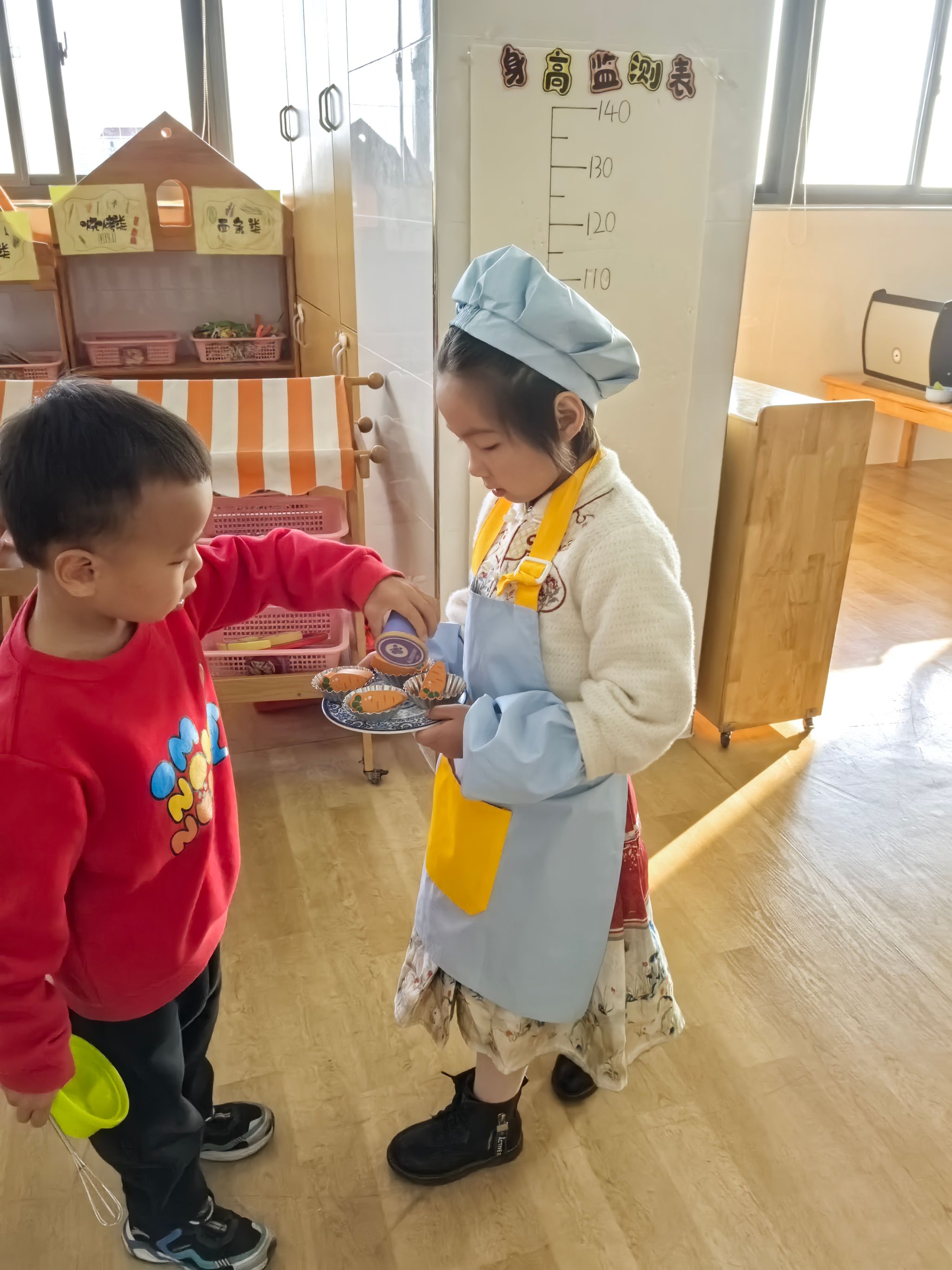 彩虹餐厅里热闹非凡,小厨神们系着围裙,拿着厨具,专注地“烹饪”着一道道美味佳肴——番茄炒蛋、可乐鸡翅、水果沙拉,每一道菜都充满了想象力。他们认真地洗着“蔬菜”、切着“食材”,还会互相配合,一个翻炒一个摆盘,分工明确又默契十足。另一边,服务员们戴着工作牌,微笑着迎接顾客,主动询问“请问您想吃点什么?”,然后快速记下菜单,把“菜品”端到顾客面前,还会贴心地说“请慢用~”。在这里,宝贝们不仅体验了厨师和服务员的职业乐趣,更学会了合作与礼貌待人。